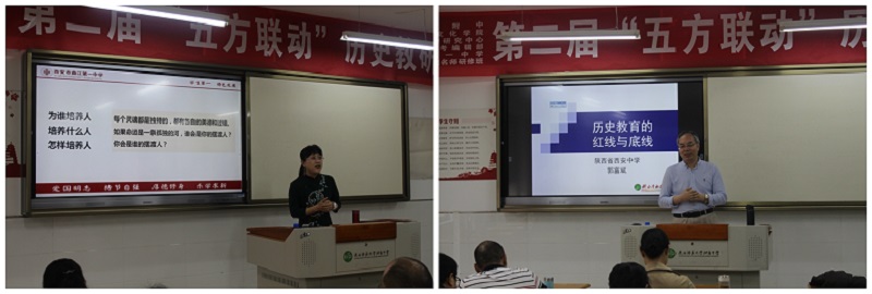 活动中,曲江一中教研室副主任罗红梅老师就“历史名师成长路径”进行讲座,通过教学课件、考察照片、微课视频等多个角度进行举例说明历史名师成长与历史教学实践的深度关联,体现出了全新的历史教学观与员工观,思考问题角度颇具新意。陕西省特级教师、西安中学教研室主任郭富斌老师进行了题为《历史教育的红线与底线》的讲座,从高中历史新课标入手,在分析了历史教育正在面临挑战的基础上,提出历史教学不能忘却的五大意识,并通过史实与大量材料,从全新的角度思考历史教育问题。