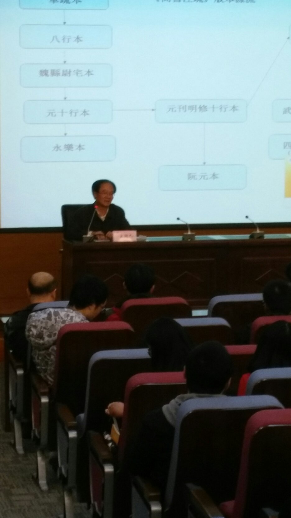 讲座前,贾老师对杜泽逊教授的到来表示热烈的欢迎和真挚的感谢,同时对杜教授做了简要的介绍。杜教授将其最新的研究成果,即对十三经中的周易和尚书的注疏版本的重新梳理和校对作了详细讲解。首先他以《周易》中的“保合大和乃利贞”这句为例,分别从唐石经、单疏本、八行本、瞿氏宋本、抚州本、篆图互注本、岳本卷、元十行本、永乐本、毛本卷、阮本卷等版本对该句进行对比校对,从而揭示了《周易》版本的来龙去脉,通过对各个版本的比对,详细分析其影印版本的刻章,并解释了“太和”的含义。之后,又对《尚书》注疏的版本源流以图表的形式进行梳理,并归纳了各版本之间的关系。最后,杜教授对本次讲座进行了简单的总结,鼓励同学们在积极学习传统文化的同时也要勇于发现问题。讲座博得在场师生的热烈掌声。