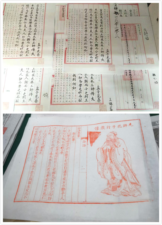 第四个体验项目是雕版印刷。主办方所选取雕版有经部的《论语》、子部的《荀子》、集部的《白氏长庆集》各一方及年画等若干方。通过亲身体验,同学们可以将雕版上的字迹或图案便完整而清晰地转印到纸上。看到自己的胜利果实,大家不仅体会到古人刻书、印书之艰辛,也明白了雕版印刷术在文化传播及传承中的作用。