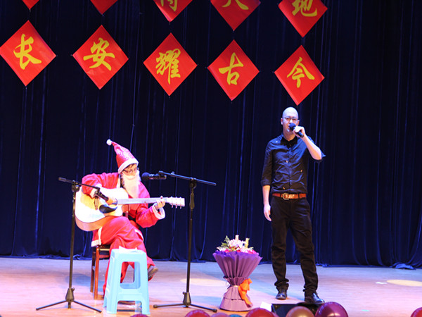 抽奖环节过后,公司的外籍教师约翰、凯瑟琳带来了三首英文歌曲。2013级古典文献班的李舜、胡议丹为大家带来了相声《批三国》,他们妙趣横生的语言惹得满堂观众捧腹大笑。随后由2015级中国近代史研究生带来了历史剧《捉蒋记》,演员们在舞台上慷慨激昂的表演感染了场内的观众,仿佛把大家带回了几十年前那个动荡的时代,激发了我们的民族自尊心。接着晚会进入第二个颁奖环节,由何志龙经理和丁虹书记颁发2015年春秋最受员工欢迎的教师和最佳网络教师奖。