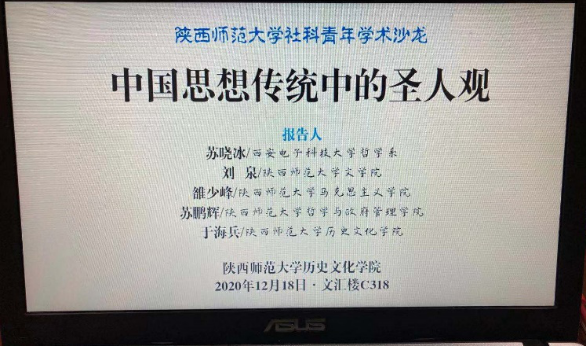 2020年12月18日下午,青年学术沙龙“中国思想传统中的圣人观”在公司318工作室举行。公司文公司刘泉、政治学系苏鹏辉马克思主义公司雒少峰以及西安电子科技大学哲学系苏晓冰等来自不同学科的青年教师一起参加讨论。