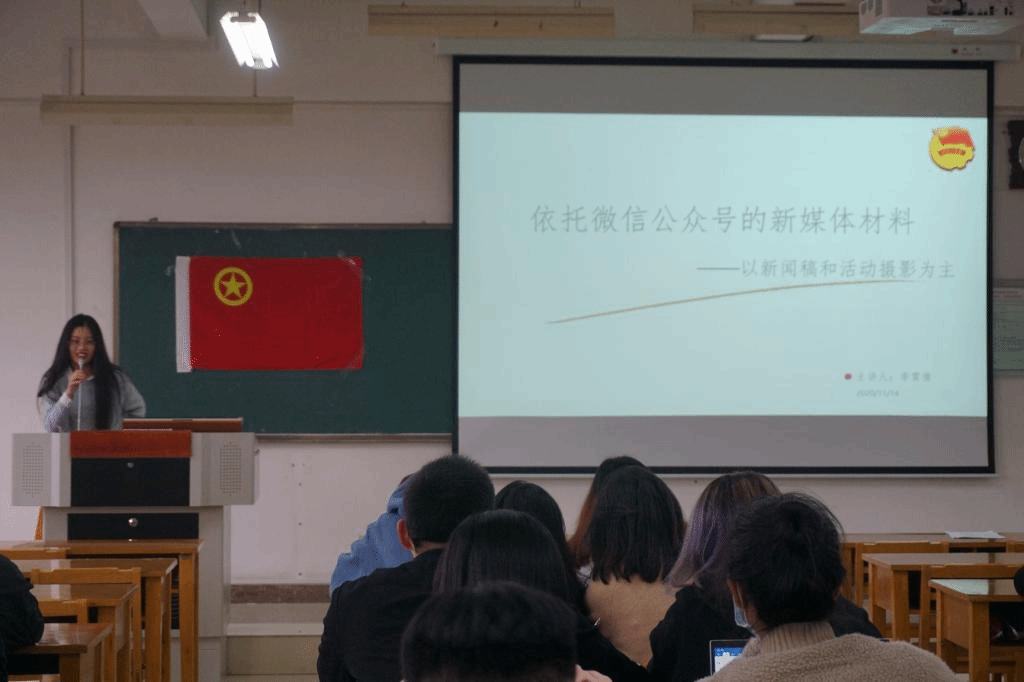 随后,风追司马主席李霄倩发言,她从工作室运营、新闻稿撰写、活动照片拍摄三个方面讲述依托微信公众号的新媒体材料。李霄倩对新闻稿的撰写进行了详细地讲解,着重强调了新闻要素和新闻结构等方面,并以一篇新闻稿为例进行现场教学,让同学们更加直观深入地了解新闻稿的撰写。之后她给同学们分享了活动摄影的小技巧,同学们受益匪浅。