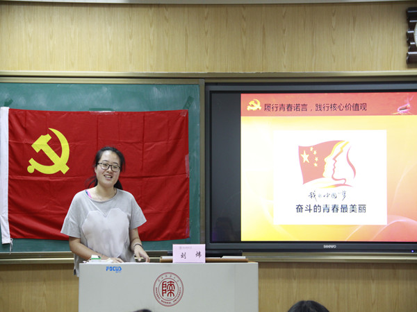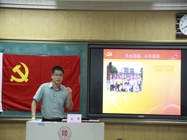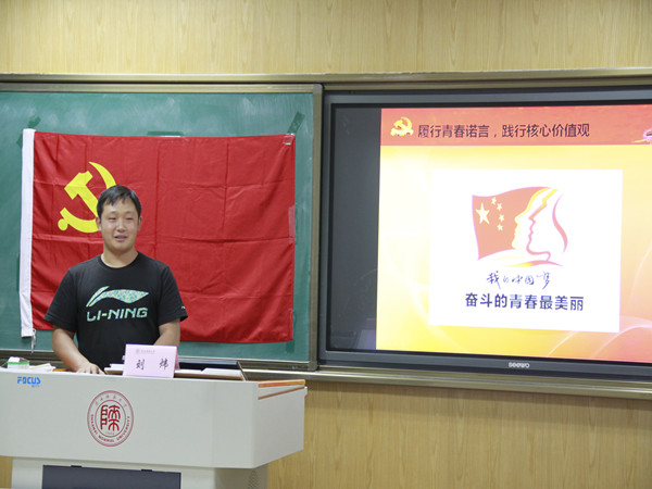 活动伊始,支部书记邓珺对刘炜学长做了简要介绍并对他的到来表示热烈的欢迎。随后,刘炜结合他自己的实践经历做了题为“履行青春诺言,践行核心价值观”的演讲。他从社会主义核心价值观的内在含义及其形成过程引入,并就为什么践行社会主义核心价值观等问题提出了独特见解;之后,他与在座支部成员分享了在山阳支教和在校团委工作期间的一些亲身经历和感受,最后,他以习近平总书记“青年选择吃苦也就选择了收获,选择了奉献也就选择了高尚”的讲话鼓励同学们要积极参加社会实践、到祖国最需要的地方去。