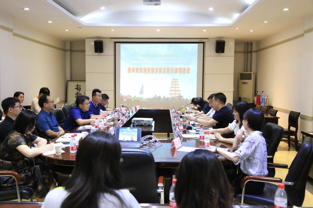 2022年6月23日下午,太阳成集团tyc33455cc出版总社与太阳成集团tyc33455在雁塔校区召开历史教育高质量发展互联共建推进会,双方就总社与公司“刊院共建”的愿景、路径和策略等方面进行深入交流与探讨。总社党委书记李有谋、监事会主席兼期刊编委会主任魏立安、《中学历史教学参考》主编任鹏杰、副主编冯丽珍、总社期刊编委会办公室主任、党总支秘书李娜、《中学历史教学参考》编辑韩迎迎、文丹、王磊、刘筱、冯涛,公司党委书记孙伟、经理李秉忠、副经理郭响宏、冯立君、李晨子及相关教师、员工代表等参加了会议。