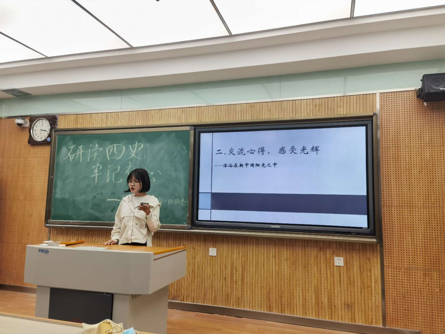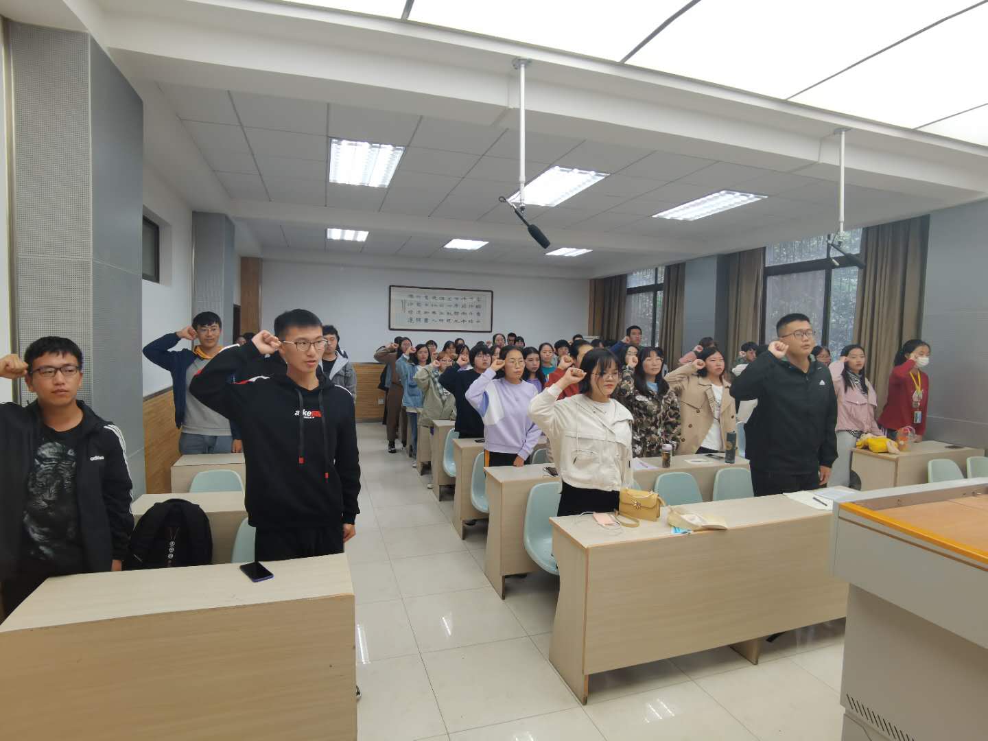 最后,与会全体团员重温了入团誓词。在声声誓词中,同学们回望初心,牢记使命,激发出爱党爱国爱社会主义的巨大热情。王奕同学说:“经过此次班会与两位同学的演讲,我不仅学习到了四史的相关知识,还了解到了新中国成立前后的艰难历程。”她表示在今后的学习中,自当努力,坚定理想信念,努力学习专业知识,提高思想道德素质,为祖国教育事业贡献力量。