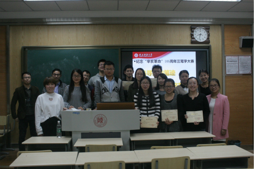 本次参赛书法种类有三,分别为硬笔字、粉笔字和毛笔字,各项比赛分别在3104(毛笔)、3105(硬笔)、3106(粉笔)教室进行。比赛书写内容均以辛亥革命中的诗词为主,毛笔字限时20分钟完成,硬笔字和粉笔字各限时15分钟完成。在现场主持人慷慨激昂的致辞中比赛开始,参赛者轮流抽签进行评比,整个过程中大家书写认真,一笔一划都倾注了书写者的自信与洒脱。现场作品中,硬笔字刚劲有力,粉笔字整洁有序,毛笔字或一板一眼,或行云流水。赛后评委们进行了精彩的点评,在众人的合影中三笔字大赛顺利落下帷幕。