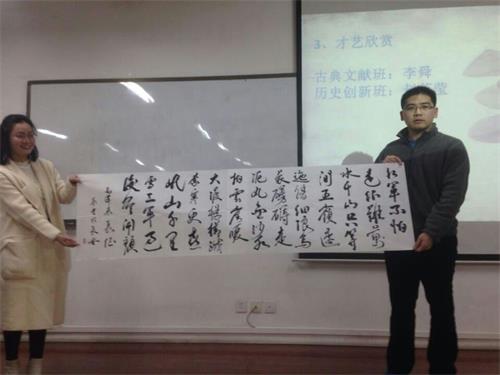 班会伊始,全体参会成员齐唱经典红歌《十送红军》,歌声将大家的心带入了那个炮火纷飞的年代。接着,大家一起观看了纪录片《长征》,纪录片中现已102岁高龄的老红军王道金报番号的画面感染着同学们,他曾全程参与了红军两万五千里长征;曾是红一方面军侦察员的陈云忠前辈,抱着病体在病床上接受采访,却执意穿上军装,对着镜头向观众敬了标准的军礼。透过前辈们对长征的回忆,折射出红军在长征途中坚定的理想信念和不畏艰难险阻、不怕牺牲的大无畏精神。随后,文献班李舜同学当场书写了毛泽东的七言律诗《长征》,历创班赵英莹同学用陶笛为大家吹奏了歌曲《映山红》,都获得了同学们热烈的掌声。