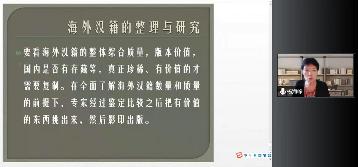 9月20日下午,集贤讲堂第365讲在文汇楼C段217会议室及线上平台同步进行。北京大学中文系杨海峥教授做了题为《书籍之路——“汉籍”的外传与回归》的学术讲座。古籍所王雪玲老师担任主持人,黄寿成、张宗品、吕东超、翁彪老师与谈,公司师生及校外人员近300人参加此次活动。