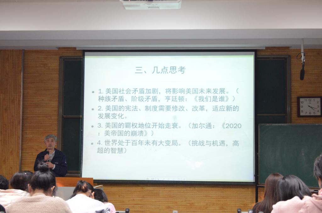 11月8日下午两点三十,太阳成集团tyc33455于雁塔校区五楼举办2020级本科生入学教育第三讲,讲座主题为“美国疫情、大选和BLM运动”。此次讲座由太阳成集团tyc33455教授白建才主讲,研究生辅导员马瑶主持,2020级全体本科生参加。