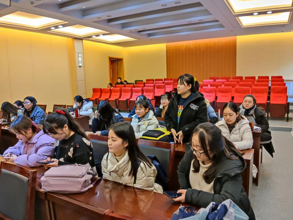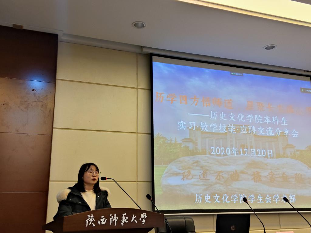 2017级历史学一班的王一曼向大家强调了在大三时师范生应该注意的相关事宜,包括磨炼心态,多写逐字稿,利用好教育心理学的知识,尽快尽早形成自己在班级内的讲课小组,练好自身有别于他人的各种专项能力,以提升自身在求职中的优势地位。她希望大家在今后的应聘过程中要沉得住气,适应紧凑节奏,不畏失败,最终更好的机会与选择一定会属于自己!