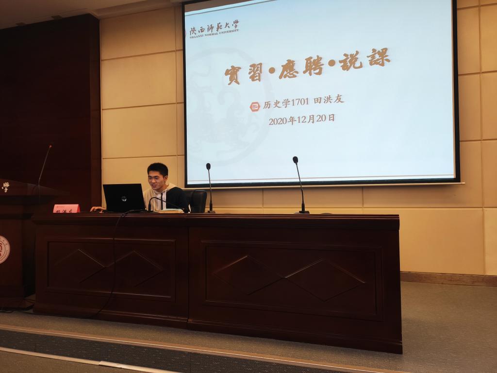 2017级历史学一班的田洪友先是介绍了自己签约公司的经历,接着则着重分享说课流程与方法。他依次从教学背景分析、教学过程、教学预测与设计反思三个方面为大家进行了详细讲解,并现场为大家演示了说课教学的完整流程。最后,田洪友还补充说明了进行课堂导入与教学主题设计的有关方法与技巧。