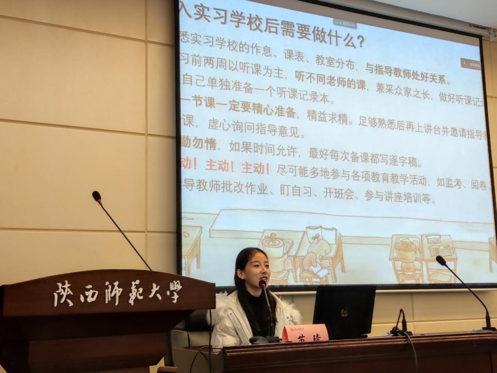 会议伊始,靳雅娜向所有参会同学表示欢迎,同时希望大家认真聆听学长学姐经验,多与前辈沟通交流,共同进步。随后,王度越向大家介绍了2017级公费师范生发言代表的获奖情况与教学经历。在全场的期待之中,学长学姐们的分享依次开始。