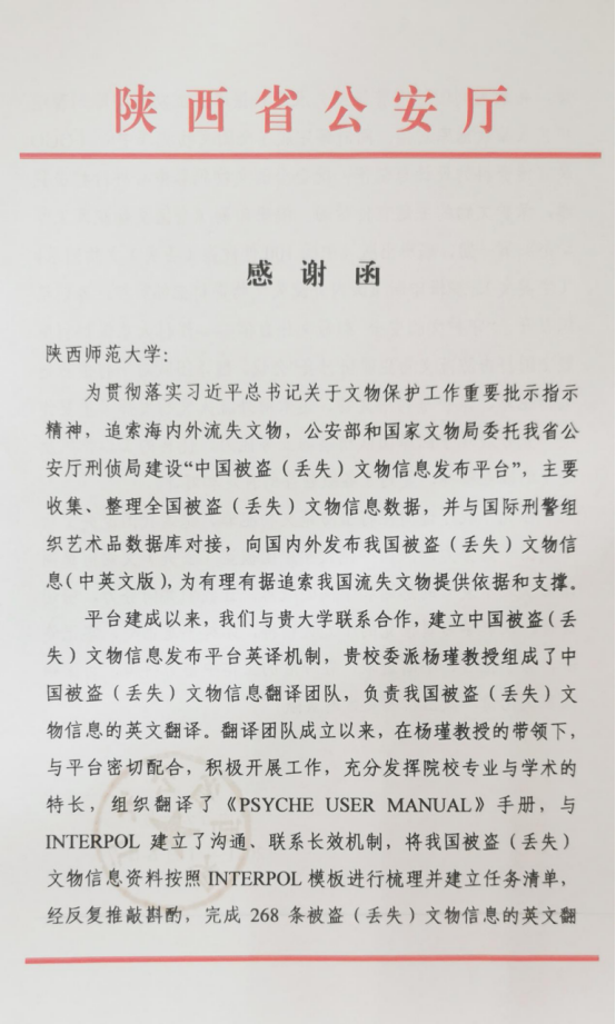 近日,受公安部和国家文物局联合委托,陕西省公安厅代表“全国文物犯罪信息中心”向公司致感谢函,对我院杨瑾教授负责太阳成集团tyc33455cc被盗(丢失)文物信息翻译团队表示崇高的敬意和衷心的感谢。