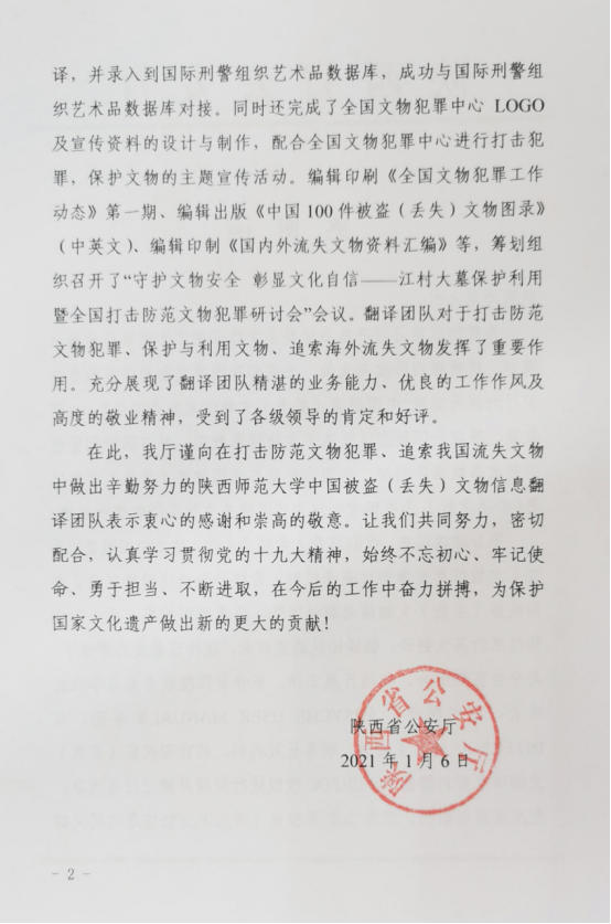 函中提到,杨瑾教授带领团队充分发挥院校专业与学术特长,利用平台收集、整理全国被盗(丢失)文物信息数据,完成了268项被盗(丢失)文物信息翻译与发布工作,及时录入国际刑警组织(INTERPOL)被盗艺术品数据库;承办“守护文物安全 彰显文化自信——江村大墓保护利用暨全国打击防范文物研讨会”;组织翻译了《PSYCHE USER》,与INTERPOL建立了沟通、联系长效机制等,对于打击防范文物犯罪、保护与利用文物、追索海外流失文物发挥了重要作用,受到各级领导的一致好评。