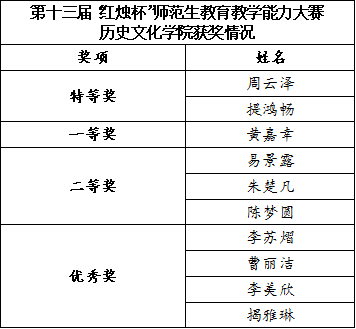 在大赛过程中,公司高度重视并积极组织备赛,公司历史教育学学科带头人徐赐成教授、历史学科教学论专业教师蔡娜副教授、公司教学副经理郭响宏副教授全程指导员工备赛。经过“公司初赛-校级复赛-校级决赛”三个环节,在公司的周密谋划组织、专业教师的悉心指导、参赛同学的精心准备下,参赛选手们不断完善教学设计,规范教学流程,取得了优异的成绩。最终,公司周云泽、提鸿畅两位同学获特等奖,黄嘉幸同学获一等奖,易景露、朱楚凡、陈梦圆三位同学获二等奖,李苏熠、曹丽洁、李美欣、揭雅琳四位同学获优秀奖。