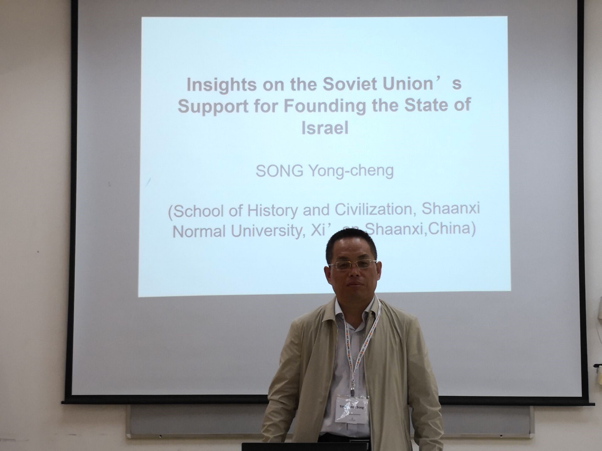 5月14日下午,宋永成在会上用英语做了“Insights on the Soviet Union’s Support for Founding the State of Israel”(苏联支持以色列建国之谜)的学术报告。宋永成在报告中指出,没有苏联的支持,以色列在1948年根本就不可能建国。尽管国内外学术界对1947-1948年苏联支持以色列建国的原因提出了8种以上的观点,但是没有一种能够完整的解释这个问题,甚至有一些观点还是相互矛盾的。宋永成利用近年来解密的苏联历史档案,首先否定了国内学术界最为流行的“同情说”观点,即苏联支持以色列建国是出于对二战中600万犹太人遭到纳粹屠杀以及战后数十万犹太人在欧洲难民营的悲惨遭遇深表同情;然后指出,斯大林在1947年5月突然放弃了布尔什维克党坚持数十年的反犹太复国主义立场,支持犹太人在巴勒斯坦建国有多重政治目的:一是为了弥补战后苏联构建的国家安全体系在西南边界地区的漏洞,二是为了把以色列做为一个“不和的金苹果”抛向中东,在阿拉伯人和犹太人之间、在英美之间制造矛盾冲突,最终达到把英国人赶出中东,把阿拉伯国家争取到苏联一边,实现向中东地区扩张的目的。这是一个步步为营,无论如何对苏联都有百利而无一害的战略决策,直到今天俄国依然在享用着斯大林当时的决策所带来的外交红利。该观点引起与会者的共鸣,美国、以色列等国家学者就此与宋永成进行了讨论交流。