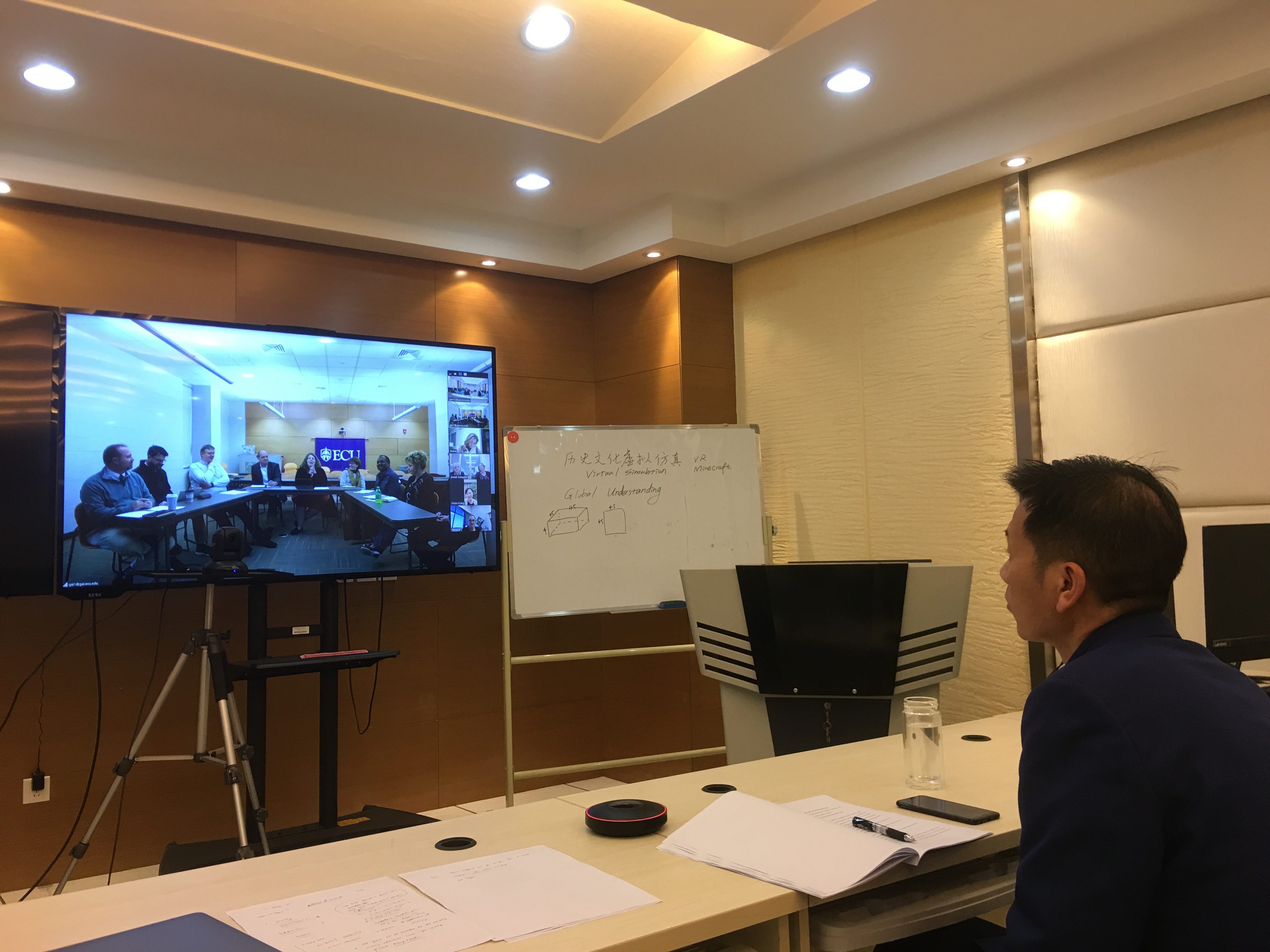 2018年12月7日晚9:00-10:00,徐赐成和张光伟通过视频会议共同参加了美国东卡罗莱纳大学召集的国际教育课程启动仪式,七所合作大学(除了国际教育课程,还有一项经济学专业的课程)的老师出席了此次会议。ECU将项目的背景、组织以及课程的开发运行模式进行了详细介绍,每所公司的课程合作负责人都把自己的专业背景以及课程开设计划进行了介绍。本项目在正式运行之前,每月都会进行一场视频会议。2019年3月课程建设工作组将在ECU举行为期一周的研讨会,共同商定课程建设相关内容。