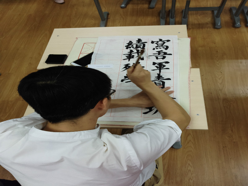 本次比赛共分三项,分别是钢笔字、粉笔字、毛笔字,各项比赛分别在3109(钢笔组)、3110(粉笔组)、3111(毛笔组)教室同时进行。比赛书写内容是与建军90周年主题相关的诗歌等。比赛在现场主持人慷慨激昂的致辞中开始,整个比赛过程中,参赛者奋笔疾书,书生意气,挥斥方遒,一笔一划都在书写青春的不悔。钢笔字行云流水、铿锵有力,粉笔字整洁明快、一气呵成,毛笔字圆熟严整、秀逸遒媚,挥毫泼墨,尽显书写功底。