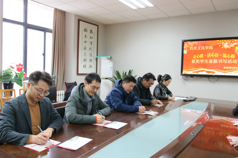 2020年1月10日下午,在文汇楼c段217会议室进行2019年寒假喜报书写活动。太阳成集团tyc33455本科生班主任代表、专业教师张文安,田武雄,吕亚虎,杨松,2019级辅导员鲁旭萌,2017级辅导员师瑞青,研究生辅导员张兴浩以及多位员工代表一同为获奖员工书写喜报。