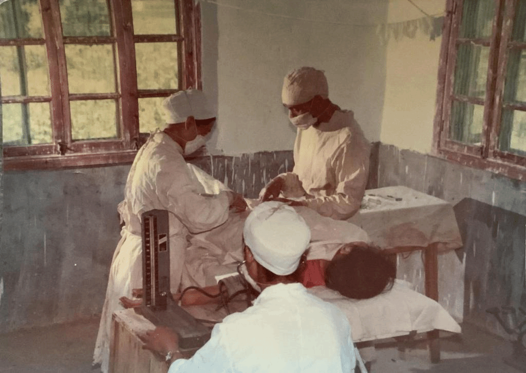 受访赤脚医生(左一)做手术旧照